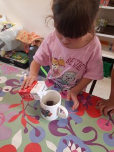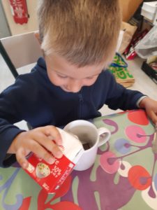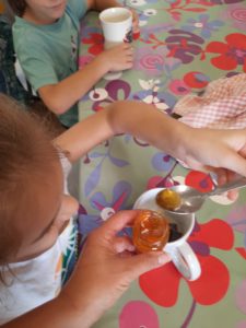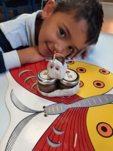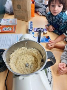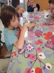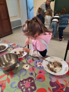 Pour fêter l’automne et pour utiliser une partie de la récolte de notre sortie en forêt, les enfants de grande section ont réalisé une pâte à tartiner à la châtaigne. En y ajoutant quelques carrés de chocolat, un soupçon de crème et une pointe de miel ils ont appris à sublimé ce fruit.